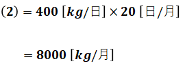 (2)も正しいです。再利用を考慮しない時の1か月の廃棄物発生量[kg/月]は、(1)の計算結果を1か月分(稼働日:20日)で考えればよいので、次のように表すことができます。