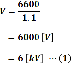 まず、Vは公称電圧を1.1で割ればよいのですが、単位が[kV]となっています。そのため、次の(1)式のようになります。