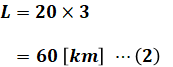 次に、Lは線路の電線延長とのことですが、これは「こう長」のことではなく、電線のトータルの長さのことを指します。よって、三相3線式の場合は「こう長」の3倍、単相2線式の場合は2倍となります。そのため、今回は三相3線式なので次の(2)式のようになります。