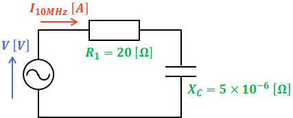 ここで、XC は R1 と比べてもはるかに小さいため、I10MHz を計算する際は R1 のみを使った近似式で問題ありません(もちろん、XC を含めて計算しても構いませんが、計算が煩雑になります)。