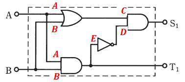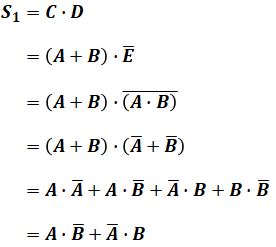 上図を見るとわかるように、S1はCとDの積で、そのCはAとBの和、他方のDはEの否定で、EはAとBの積であることがわかります。よって、これを式で表すと、次のように書くことができます。