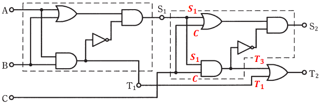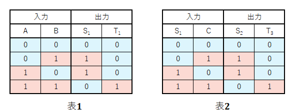 1. A=0、B=0、C=0を入力したときの出力は、S2=0、T2=1である。