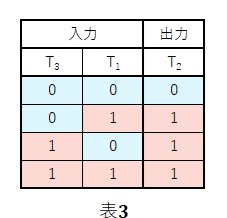 また、T2の値を求めるための真理値表は次のようになります。