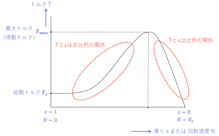 図を見てもわかる通り、滑りsがある値をとったときにトルクTが最大になるという点があります。このときのトルクのことを、最大トルクまたは停動トルクといいます。図中ではTmaxと表記しているところです。