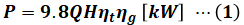 水力発電において、使用水量Q[m3/s]で運転しているときの発電機出力P[kW]は、次の式で表すことができます。これは重要事項として押さえておくべき公式です。