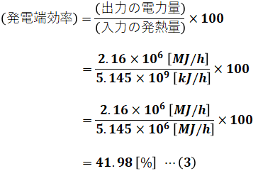 以上の(1)式、(2)式より、発電端効率は次のように算出することができます。ただし、(1)式と(2)式はこのままでは単位が少し違うので、比の計算をする際には[kJ/h]または[MJ/h]のどちらかに揃えることを忘れないようにしてください。