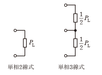 負荷の総容量は同一であり、3線式の場合、負荷は図のように線間に均等分割されるものとする。単相2線式での線路の抵抗損を1とすると、単相3線式の線路の抵抗損は1/5であった。