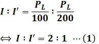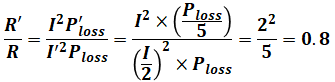 ここで、(1)式よりI:I’=2:1であり、問題文よりPloss:P’loss=5:1です。よって、(4)式は以下のように計算を進められ、求める答えを算出することができます。