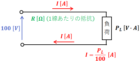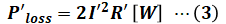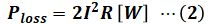 また、単相2線式は線路が2本なので、線路損失Ploss[W]は次に示す(2)式で表すことができます。
