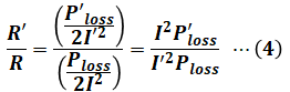 問われているのは、単相2線式での線路の1線当たりの抵抗R[Ω]に対する単相3線式での線路の1線当たりの抵抗R’の値(=R’/R)なので、この比に(2)式と(3)式を代入すると、次の(4)式のようになります。