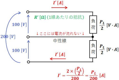 上図から、単相2線式を流れる電流I[A]と単相3線式を流れる電流I'[A]の関係は次のようになります。