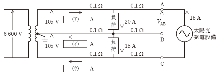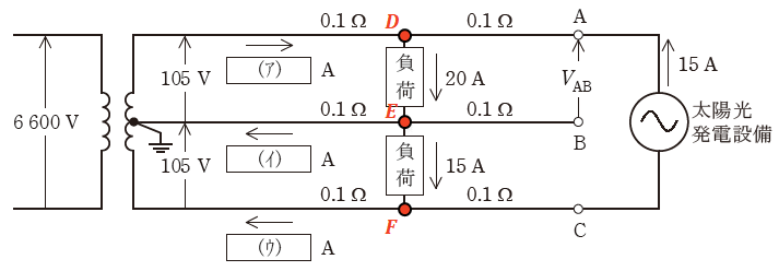 図のような単相3線式配電線路がある。系統の中間点に図のとおり負荷が接続されており、末端のAC間に太陽光発電設備が逆変換装置を介して接続されている。