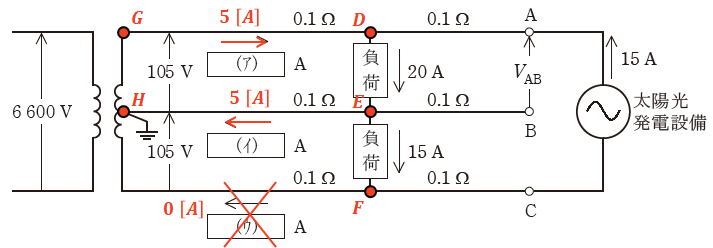 ただし、図示していないインピーダンスは無視するとともに、線路のインピーダンスは抵抗であり、負荷の力率は1、太陽光発電設備は発電出力電流(交流側)15A、力率1で一定とする。