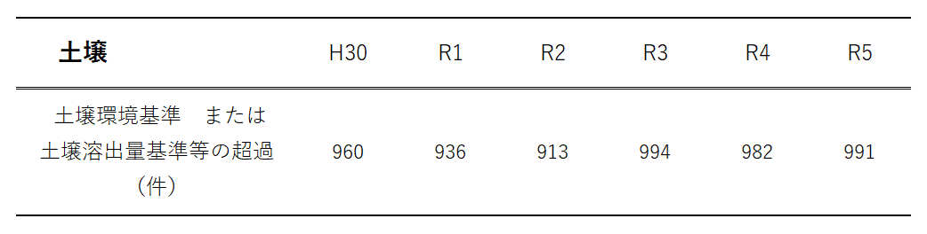 主な基準超過項目は、いずれの年も「鉛」、「ふっ素」、「ひ素」の3つです。
