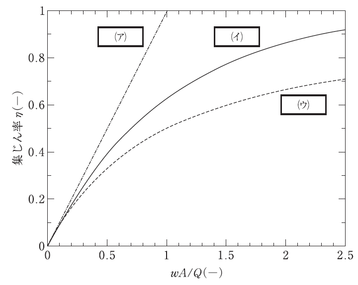 この場合、最も粒子の分離速度wや全集じん面積Aに比例して集じん率が上がり、処理ガス流量Qを多くするとそれに反比例して集じん率が下がるという、わかりやすい対応が見られます。よって、(ア)がAに対応します。