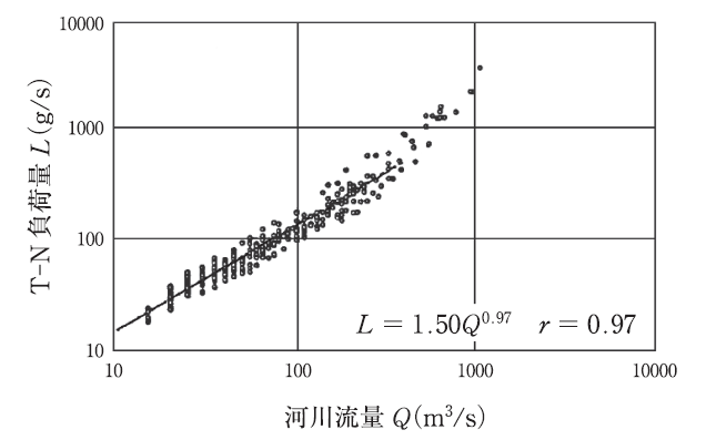 下図は、ある一級河川で観測された河川流量Q(m3/s)と全窒素負荷量L(g/s)の関係をプロットし、約10~約500m3/sの範囲の流量についてその関係を近似式で表したものである(rは相関係数である)。