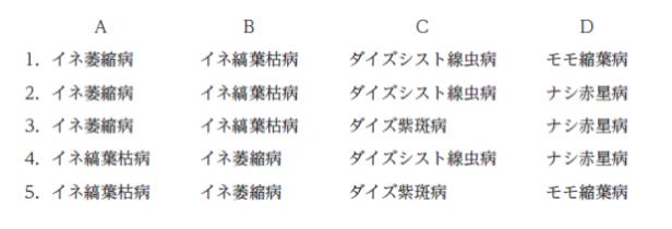 次は、作物や果樹の病害に関する記述であるが、A~D に当てはまる病害の組合せとして最も妥当なのはどれか。