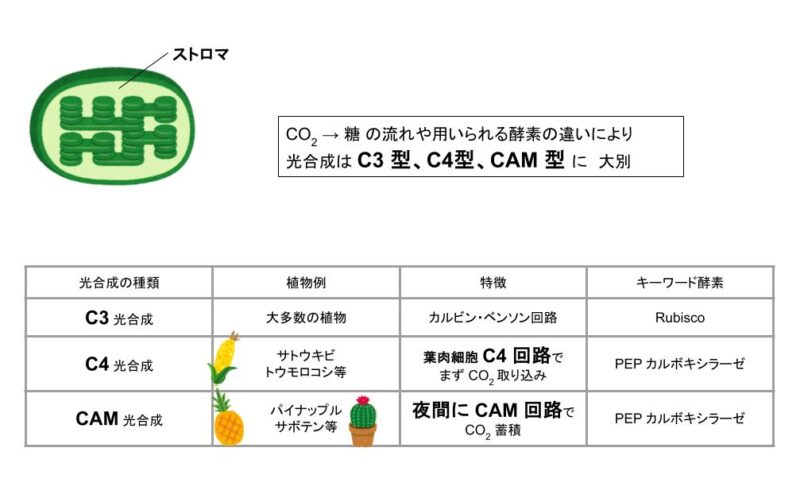 C3 型は まず Rubisco という酵素が、RuBP (リブロース1,5-ビスリン酸) + CO2 を触媒し、CO2 を取り込む点が特徴です。PEP カルボキシラーゼは、サトウキビなどの C4 型植物で用いられる酵素です。選択肢 4 は誤りです。