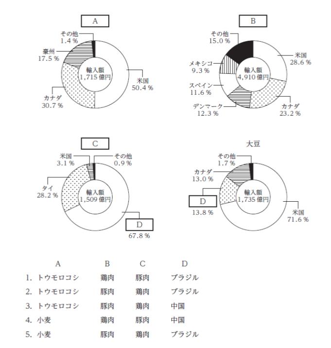 選択肢より トウモロコシかコムギです。トウモロコシであれば、ブラジルが入ってきます。1位:米国、2位:カナダ、3位:豪州となっており、ブラジルがいないため、A は「小麦」です。正解は 4 or 5 です。