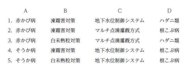 マルチ点滴灌漑方式は、園地をシートで覆う「マルチ被覆」と、点滴チューブで根元に水を供給する「点滴灌水」を組み合わせた栽培技術です。みかんの栽培などで用いられる方式です。大豆についてではないと考えられます。C は「地下水位制御システム」です。これにより、D は ハダニ類とわかります。