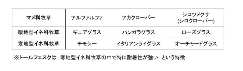寒地型イネ科牧草についての記述です。選択肢 3 ~ 5 に出てきた牧草を中心にまとめた表が以下になります。