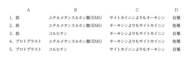 染色体の倍加はコルヒチン処理です。エチルメタンスルホン酸は、突然変異を誘発する薬剤です。これにより、C は「オーキシンよりもサイトカイニン」、D は「自殖」とわかります。