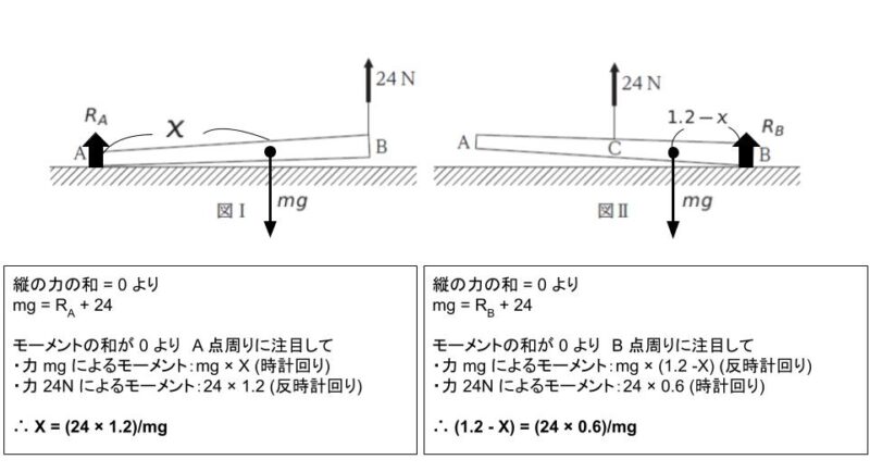 持ち上げている時は静止しています。つまり、縦の力の和 = 0、横の力の和 = 0、モーメントの和が 0 です。図Ⅰの点 A における上向きの力を RA、図Ⅱの点 B における力を RB とおき、点 A から重心までの距離を x とします。以下のようにまとめることができます。