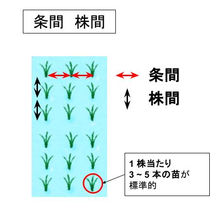 栽植は、苗を田んぼに植えることです。栽植密度は「単位面積当たり 植付け株数」×「1 株当たり苗数」です。植付け株の栽植密度は条間 30 cm、株間 15 〜 18 cmが一般的です(条間、株間のイメージは下図参照)。また、1 株当たり苗数は 3 〜 5 本/株 が適当とされます。