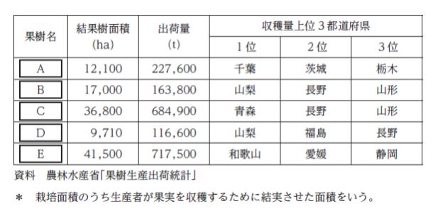 残りのブドウ、ニホンナシ、モモ ですが、ブドウとモモは第一位が 山梨です。そのため、消去法で 1 位が千葉である A が「ニホンナシ」です。2 位が長野である B が「ブドウ」、2位が福島である D が「モモ」です。まとめると、A:ニホンナシ、B:ブドウ、C:リンゴ、D:モモ、E:ウンシュウミカン です。