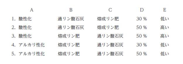 次は、肥料の特性と利用に関する記述であるが、A ~ E に当てはまるものの組合せとして最も妥当なのはどれか。