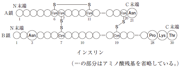 下図は、インスリンの構造を模式的に示している。図中の ○ はアミノ酸残基を示し、特徴のあるアミノ酸残基を 3 文字表記している。