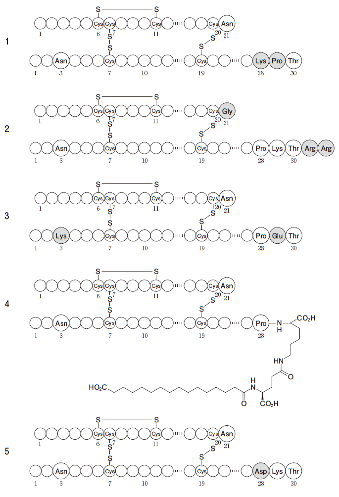 近年、インスリンの化学構造を部分的に改変することで、治療目的に沿った血糖降下作用を発揮するインスリンアナログ製剤 (1 ~ 5) が開発されている。