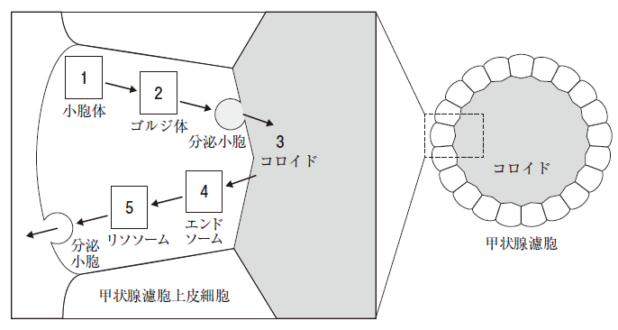 下図は、甲状腺濾胞において T3、T4 が作られるまでに、チログロブリンが移動する流れを示したものである。チログロブリンは甲状腺濾胞上皮細胞で作られてからコロイド中に分泌され、再び甲状腺濾胞上皮細胞に取り込まれ、最終的に T3、T4 が濾胞外に分泌される。