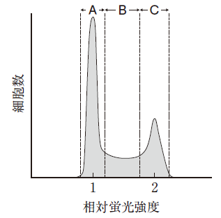 S 期を経て DNA 量が倍増するので、S 期よりも前の時期である G1 期の細胞は 相対蛍光強度が 1 の領域に、S 期よりも後の 時期である G2 期の細胞は 相対蛍光強度が 2 である領域 C にそれぞれ分布します。