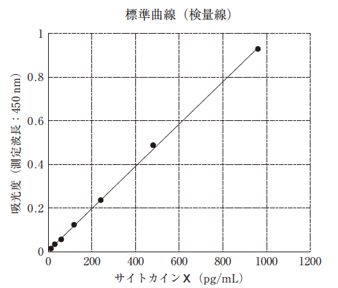 各試料をマイクロプレートに採取し反応を行った後、450 nm の吸光度を測定した。サイトカイン X の標準物質を用いて標準曲線 (検量線) を作成したところ、下図のようになった。