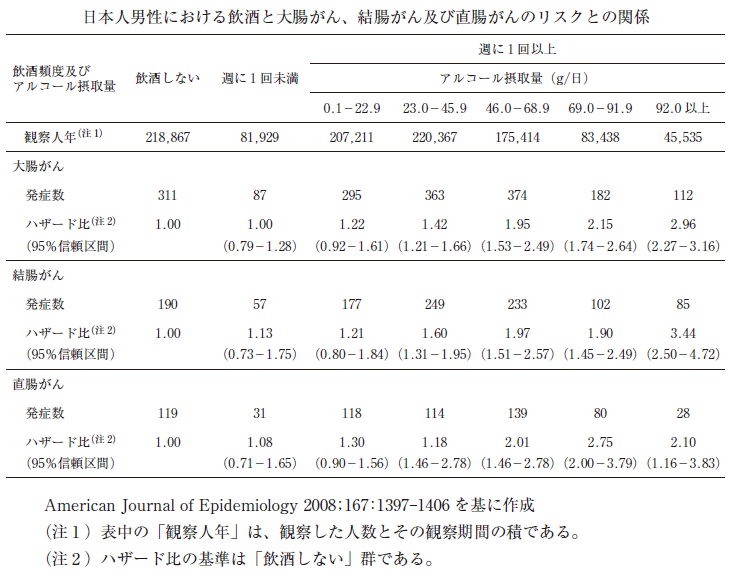 ただし、下表を基に算出した「飲酒しない群」の大腸がん発症率は 10 万観察人年当たり 142 人、「23.0 g/日以上のアルコール摂取群」の大腸がん発症率は 10 万観察人年当たり 196 人である。