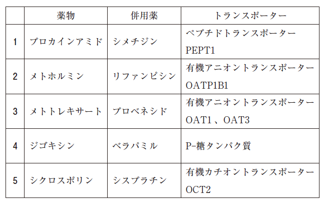 プロカインアミドとシメチジンは、共に有機カチオン輸送系で分泌されるので排泄が阻害されることにより血中濃度が上昇します。「PEPT1」ではありません。選択肢 1 は誤りです。