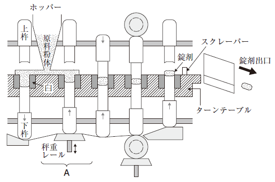 回転しながら打錠する ロータリー打錠機 のイメージをふまえて、与えられた図を読み取ることが期待されている問題と思われます。