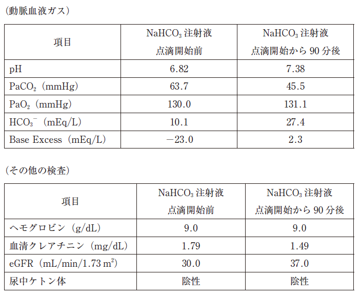 生理食塩液の持続投与下で動脈血液ガス等を確認した結果、医師は 8.4 w/v% 炭酸水素ナトリウム(NaHCO3) 注射液の点滴を開始した。点滴開始から 90 分後に状態の改善を認めた。