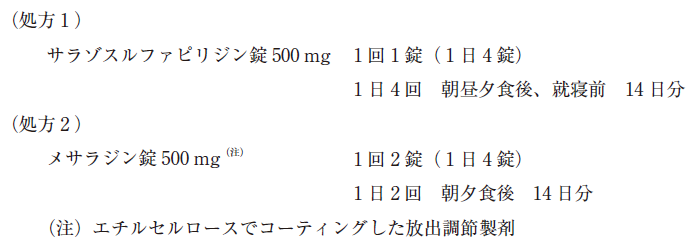 31 歳女性。1 ケ月前に粘血便、下痢が出現したため近所の消化器内科を受診し、大腸内視鏡検査により全大腸炎型潰瘍性大腸炎と診断された。医師との面談で、患者が安価な治療を望んだため、処方 1 による治療が開始され症状は改善した。