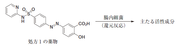 処方 1 の薬物は、大腸へ到達後、下図のように、腸内細菌により代謝 (還元) されて効果を示す。