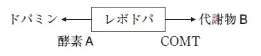 下図に示すように、レボドパは、末梢で酵素 A が触媒する反応によってドパミンに、カテコール – O – メチルトランスフェラーゼ (COMT) によるメチル化によって代謝物Bに変換される。
