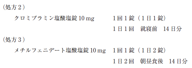選択肢 4 が処方 3 のメチルフェニデート塩酸塩、選択肢 5 が処方 2 のクロミプラミンに、それぞれ対応します。