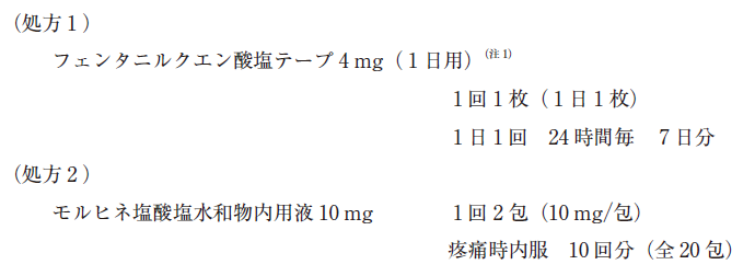 68 歳女性。15 年前、乳がんにより右乳房の切除術を受けた。再発なく経過していたが、3 年前に腰痛が出現し、骨転移、胸膜転移及び右胸水を認めたため、再発と診断された。オピオイドによる疼痛管理が開始され、1 年前からは緩和医療に移行し、処方 1 及び処方 2 の薬剤を使用していた。