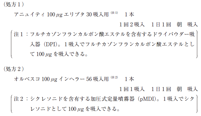 しかし、数日後、家族が薬局に来局し、「処方 1 の薬剤を吸入するとむせるようになり、吸入が困難になった」と話した。薬剤師が処方医にこの情報を提供したところ、再診察を行い処方 1 を処方 2 に変更した。
