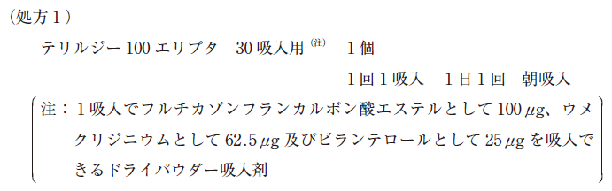 処方 1 は ステロイド であるフルチカゾン、抗コリン薬 である ウメクリジニウム、β 刺激薬であるビランテロールを配合した吸入薬です。
