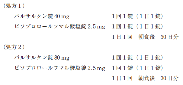 68 歳男性。身長 172 cm、体重 63 kg。高血圧症及び慢性心不全のため処方 1 の薬剤を服用していた。今回の受診で血圧が 164/90 mmHg を示し、処方 2 へ変更となり、処方箋を持って薬局を訪れた。