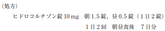 検査の結果、コルチゾールの低値及び ACTH の高値が認められ、アジソン病の確定診断を受け、以下の処方が開始となった。