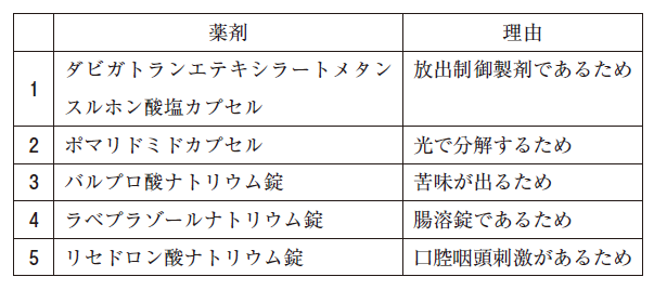 バルプロ酸は粉砕してはいけません。理由は空気中の湿気による潮解です。「苦味が出るため」ではありません。選択肢 3 は誤りです。