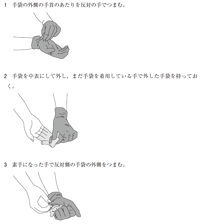 「素手になった手で、汚染された外側を触らないよう袖口内側に指を突っ込み」手袋を引き上げるように裏返して外します。
